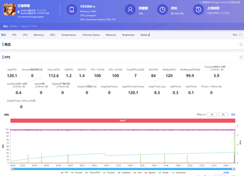 在《王者荣耀》开启高画质的情况下,S50在半小时的游戏过程中,平均帧率达到120.1帧,整体表现相当稳定。在测试全程中,S50没有出现明显的卡顿或发热降频现象。4200mm²的超大VC液冷均热板功不可没,它能有效覆盖核心热源,保证手机在长时间高负载运行下依然冷静。
